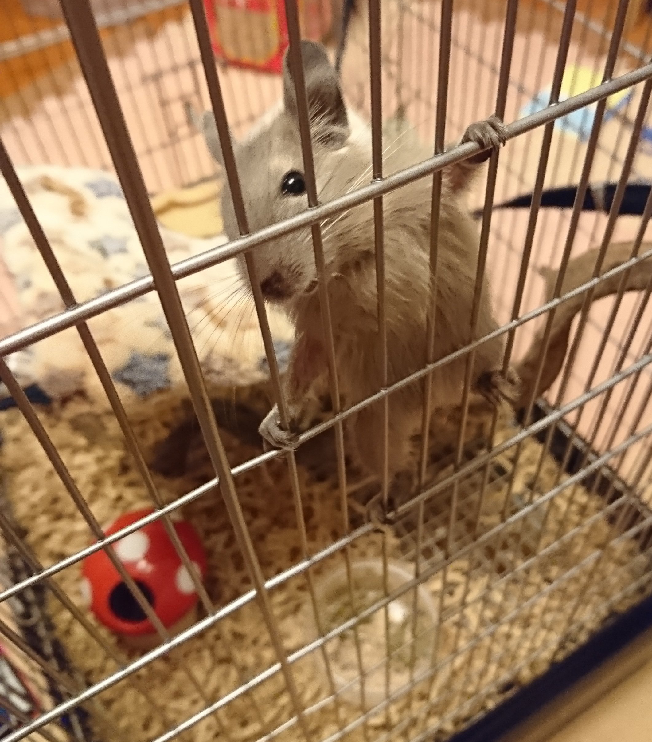 ハムスターっぽいけど、草食だし、昼行性だし、しっぽは長いし、ジャンプ力があるから鳥かごレベルの高さのゲージが必要のようですが、人には懐きやすいみたいです。